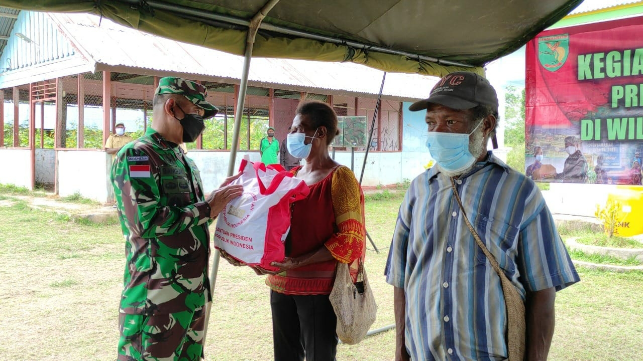 REPUBLIKEXPOSE.COM – (Merauke). Komandan Komando Resor Militer (Danrem) 174/ATW Merauke Brigjen TNI Bangun Nawoko di dampingi para pejabat Korem 174/ATW membagikan-bagikan bingkisan bantuan sembako bagi masyarakat Merauke dari Presiden Republik Indonesia Ir. Joko Widodo melalui Sekretariat Kepresidenan, bertempat di Kampung Kamangi, Distrik Tanah Miring, Kab. Merauke, Senin (06/09/2021).