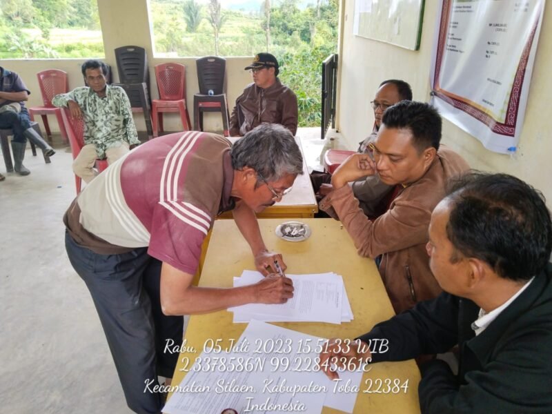 Polsek Silaen bersama Kepala Desa, Perangkat desa, dan Tokoh Masyarakat mediasi masalah batas tanah di Toru Gorat Desa Ombur Kecamatan Silaen, Toba, Provinsi Sumatera Utara, Rabu (05/7/2023).