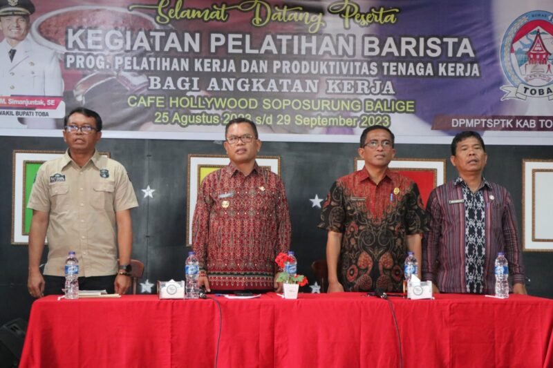 Dinas Penanaman Modal Pelayanan Terpadu Satu Pintu dan Ketenagakerjaan Kabupaten Toba melatih cara mengolah kopi yang enak bertempat di Hollywood Cafe, Balige, Jumat (25/08/2023). Bupati Toba, Poltak Sitorus membuka pelatihan tersebut, yang diikuti oleh 20 peserra dari 3 kecamatan, yakni Kecamatan Balige, Tampahan dan Laguboti.