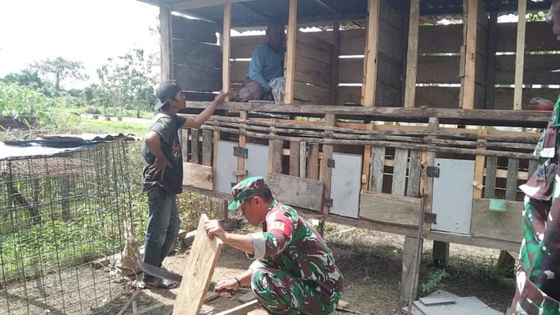 Ringankan Beban Warga Binaan, Babinsa Koramil 1710-07/Mapurujaya Bantu Membuat Kandang Ayam Milik Warga