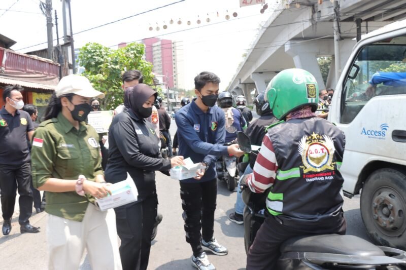 Polres Metro Jakarta Barat melalui Si dokter (Dokkes) berkolaborasi dengan mahasiswa dari Universitas Mercu Buana dan Universitas Esa Unggul untuk memberikan edukasi dan membagikan masker serta vitamin kepada pengendara yang melintas di Jalan Daan Mogot, Jumat, (15/9/2023).