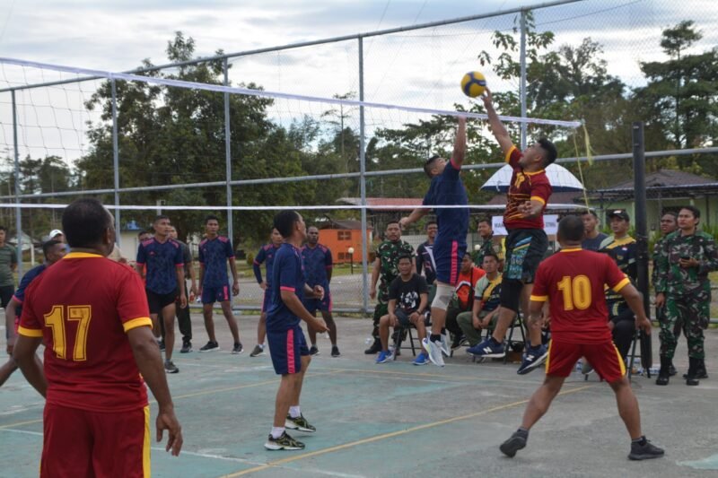 Turnamen Bola Voli Kodim 1710/Mimika dalam rangka menyambut HUT Ke-78 Tentara Nasional Indonesia Tahun 2023 memasuki babak final yang berlangsung di Lapangan Voli Makodim 1710/Mimika, Jumat (22/9/2023). Dandim 1710/Mimika Letkol Inf Dedy Dwi Cahyadi turut langsung dalam partai final bola voli putra. Partai final mempertemukan tim Makodim 1710/Timika lawan Tim Koramil 02/Timika yang dimenangkan oleh Tim Koramil 02/Timika dengan skor 3-1.