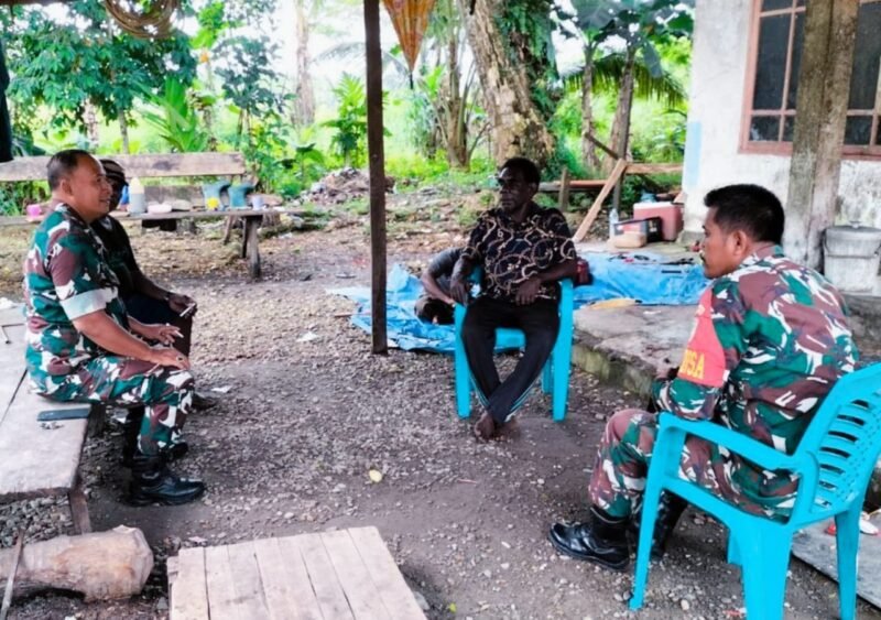 Babinsa Koramil 1710-07/Mapurujaya Kodim 1710/Mimika, Peltu Monab dan Sertu Slamet melaksanakan kegiatan rutin yang merupakan salah satu bagian tugas pokoknya yaitu melaksanakan komunikasi sosial secara langsung dengan Kepala Kampung Ayuka Bapak Frans Memetapo, bertempat di Kampung Ayuka, Distrik Mimika Timur, Kabupaten Mimika, Selasa (10/10/2023).