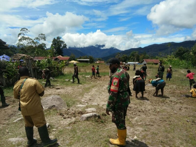 Babinsa Koramil 171005/Jila dipimpin Sertu Niko Kararbo bersama warga masyarakat melaksanakan kegiatan kerja bakti membersihkan jalan utama Kp. Pasir Putih, Distrik Jila Kab. Mimika, Senin (16/10/2023).