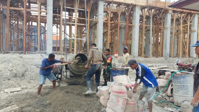 Sebagai bentuk kepedulian kepada tempat peribadatan di wilayah binaannya, Babinsa 1710-02/Timika dipimpin Sertu Tumpak Marpaung membantu kegiatan pembangunan rumah Pastori Gereja Kingmi, di Kp. Ninabua, Distrik Mimika Baru, Kabupaten Mimika, Selasa (31/10/2023). Kegiatan tersebut merupakan implementasi pembinaan teritorial dan dukungan dari Babinsa dalam meningkatkan kesejahteraan warga binaannya.