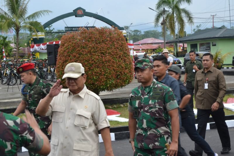Menteri Pertahanan RI Prabowo Subianto mengunjungi Kodim 1710/Mimika dalam rangka menyerahkan Kendaraan Dinas Prajurit TNI-Polri, bertempat di Lapangan Upacara Makodim 1710/Mimika Jl. Agimuga Mile 32, Distrik Kuala Kencana, Kab. Mimika, Jumat (10/11/2023).