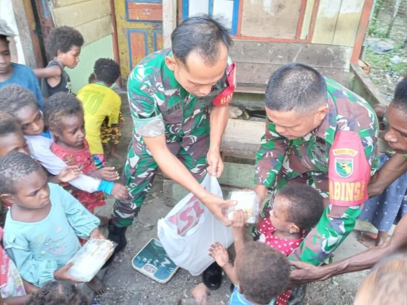 Peduli dengan pertumbuhan anak di wilayah binaan, Babinsa Koramil 1710-07/Mapurujaya Sertu Tangkas Budiono dan Sertu Yulius Nampe melalui kegiatan binternya hari ini, memberikan makanan tambahan kepada anak-anak di wilayah binaan Kp. Muare, Distrik Mimika Timur, Kab. Mimika, Sabtu (18/11/2023).