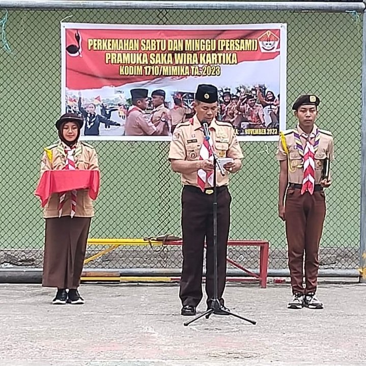 Kasdim 1710/Mimika Mayor Inf Abdul Munir pimpin upacara penutupan Persami Pramuka Saka Wira Kartika bertempat di lapangan futsal Kodim 1710/Mimika Jl. Agimuga Mile 32, Distrik Kuala Kencana, Kab. Mimika, Minggu (26/11/2023).