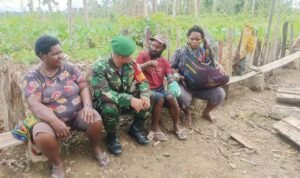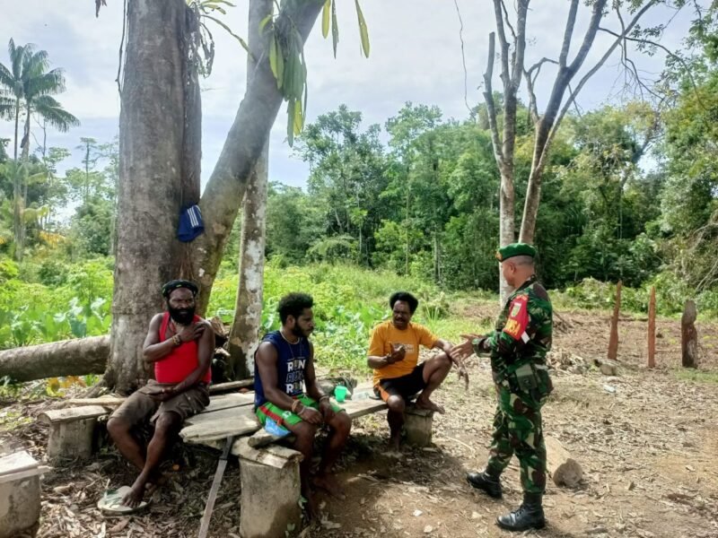 Babinsa Koramil 1710-02/Timika Sertu Eliza Serusiay melaksanakan Komsos (Komunikasi Sosial) dengan salah satu masyarakat binaan keluarga Jak Jeckson di Kp. Amole, Distrik Kwamki Narama, Kab. Mimika, Rabu (29/11/2023).