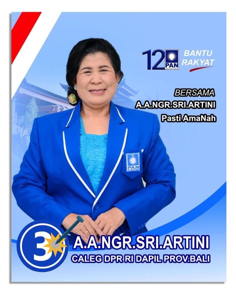 AA NGR Sri Artini saat ini tercatat sebagai Caleg DPR RI Nomor Urut 3 dari Dapil Bali yang diusung oleh Partai Amanat Nasional (PAN) itu, akan perjuangkan dunia pariwisata Bali kembali berjaya ke seantero dunia.