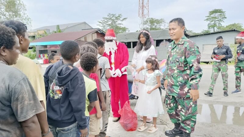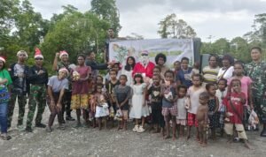Tampak gembira, dan penuh kedamaian terlihat dari wajah anak-anak di sepanjang jalan Agimuga dan Kp. Lemasa Distrik Kuala Kencana setelah kehadiran Sinterklas Kodim 1710/Mimika dipimpin Pasiops Kodim Kapten Inf Helly Sukmajaya saat membagikan bingkisan, Jumat (22/12/2023).