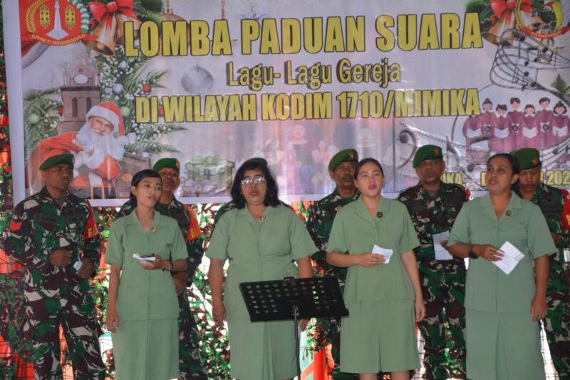 Sebanyak 8 grup paduan suara mengikuti lomba paduan suara dalam rangka menyambut Bulan Kasih Natal 2023 yang diselenggarakan oleh Kodim 1710/Mimika, bertempat di Pendopo Darmawangsa Makodim Jl. Agimuga Mile 32, Distrik Kuala Kencana, Kab. Mimika, Kamis (21/12/2023).