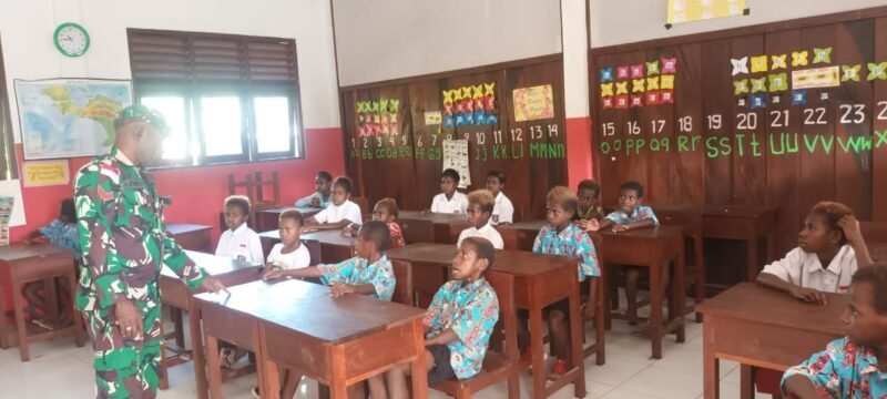 Dalam rangka menanamkan rasa cinta tanah air kepada generasi penerus guna meningkatkan wawasan, khususnya keikutsertaan dalam menjaga keutuhan Negara Kesatuan Republik Indonesia (NKRI) sejak dini, Bintara Pembina Desa (Babinsa) Koramil 1710-03/Kuala Kencana Koptu Alfaris Kumiyu berkoordinasi dengan guru untuk memberikan pembekalan materi Wawasan Kebangsaan kepada siswa-siswi SD YPPK ST. Yakobus di Kp. Iwaka, Distrik Iwaka, Kab. Mimika, Sabtu (20/01/2024).