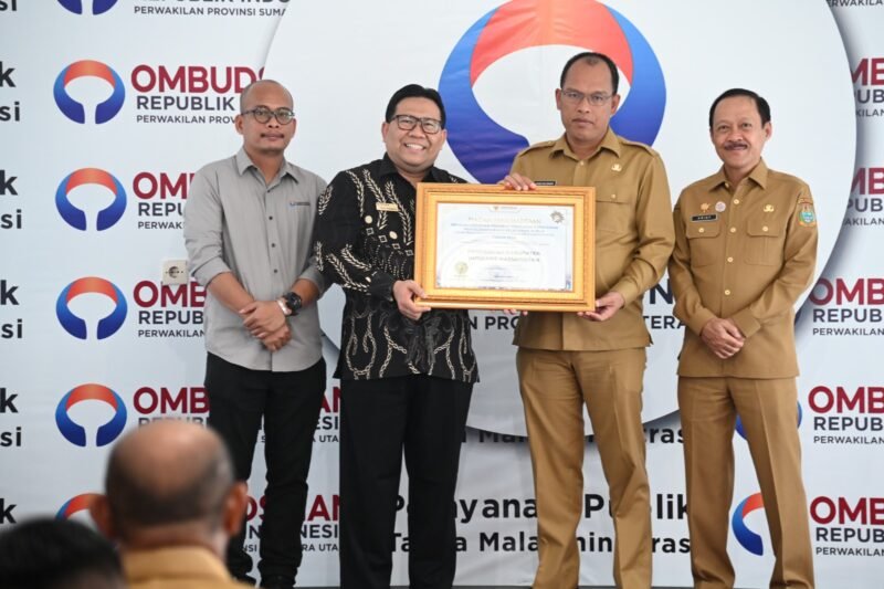 Anggota Ombudsman RI Dadan Suparjo Suharmawijaya bersama Pjs Kepala Ombudsman Perwakilan Sumut James Marihot Panggabean, S.H., M.H. didampingi Sekda Provsu Arief Sudarto Trinugroho serahkan piagam penghargaan bidang Penyelenggaraan Pelayanan Publik kepada Bupati Humbahas Dosmar Banjarnahor SE bertempat di Kantor Ombudsman Perwakilan Sumut Jalan Asrama Medan, Selasa (23/1/2024).