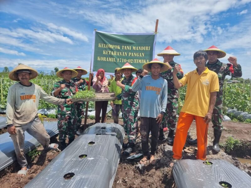 Dalam rangka membantu pemerintah mewujudkan ketahanan pangan, Babinsa Koramil 1710-02/Timika dipimpin Serma Butarbutar ajak kelompok tani binaan tanam 7000 bibit Melon di kebun percontohan milik Koramil 1710-02/Timika Jl. Irigasi Kel. Pasar Sentral, Distrik Mimika Baru, Kab. Mimika, Jumat (26/01/2024).