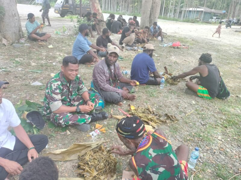 Guna menciptakan suasana aman, damai dan kondusif jelang Pemilu serentak tahun 2024 dan sesudah pelaksanaan Pemilu,  Danramil 1710-04/Tembagapura Kapten Chb Eliazar Manuk Allo memberikan pesan damai kepada warga binaannya yang sedang melaksanakan acara adat bakar batu dalam rangka penyelesaian masalah, bertempat di Distrik Kwamki Narama, Kab. Mimika, Kamis (08/02/2024).