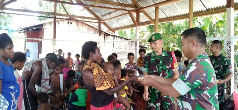 Wujud kepedulian terhadap perkembangan anak-anak dan balita di wilayah binaan, anggota Koramil 1710-07/Mapurujaya dipimpin Danramil Kapten Inf Hely Sukmajaya melaksanakan kegiatan pengecekan serta pembagian PMT (Pembagian Makanan Tambahan) bagi anak-anak dan balita guna menurunkan angka stunting di Wilayah Kp. Muare, Distrik Mimika Timur, Kab. Mimika, Senin (15/04/2024).