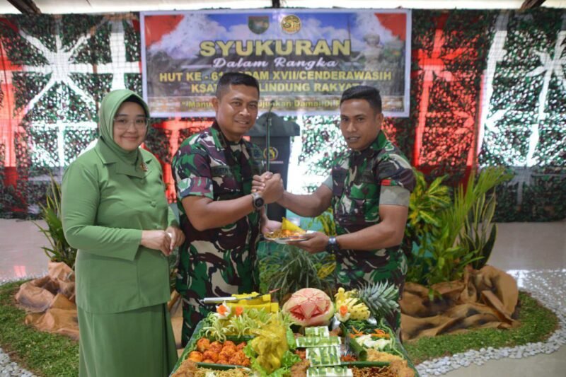 Acara syukuran yang merupakan Puncak Peringatan HUT Ke-61 Kodam XVII/Cenderawasih ini ditandai dengan prosesi pemotongan tumpeng oleh Dandim 1710/Mimika didampingi Ketua Persit KCK Cab. XXXV, yang kemudian diserahkan kepada Prajurit termuda dan PNS tertua.