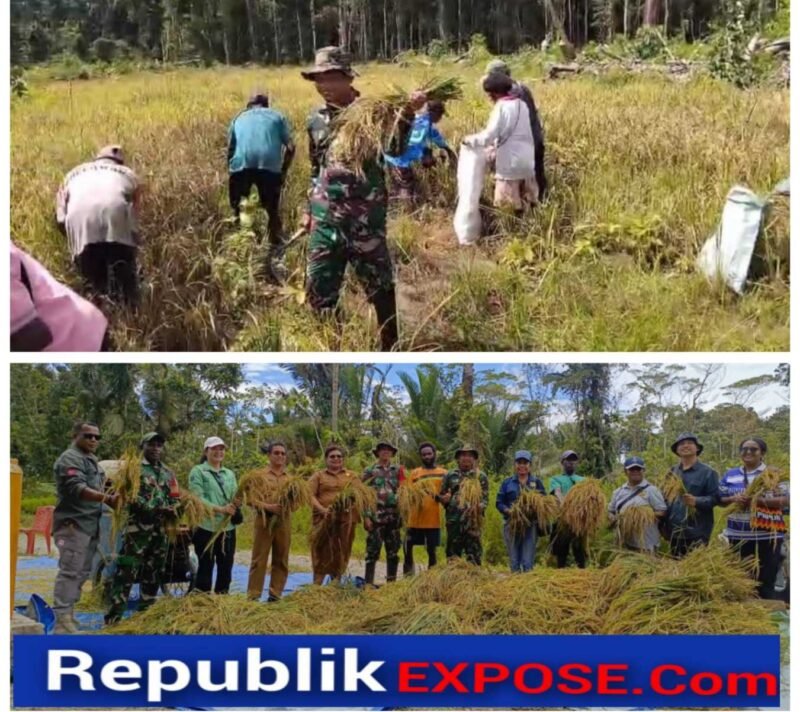 TIMIKA // – Dalam rangka mendukung ketahanan pangan sekaligus meningkatkan produktivitas pertanian, Pelda Safi’i bersama 4 Babinsa Koramil 1710-03/Kuala Kencana Kodim 1710/Mimika, bersama warga Kampung Iwaka dan Dinas Pertanian Kabupaten Mimika, melaksanakan panen padi gogo, Selasa (02/9/2025).