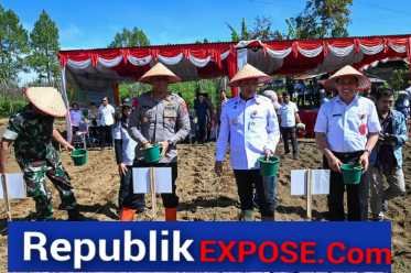 RepublikeXpose. ComDOLOKSANGGUL // – Bupati Humbang Hasundutan Dr Oloan P Nababan ,SH ,MH bersama Kapolres Humbang Hasundutan AKBP Arthur Sameaputty termasuk TNI dan masyarakat menanam benih jagung di Desa Pasaribu Kecamatan Doloksanggul, Rabu 8 Oktober 2025. Penanaman serentak ini merupakan komitmen bersama untuk mewujudkan swasembada pangan secara nasional.