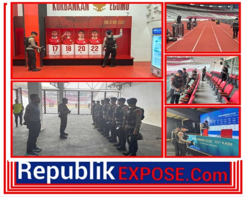 RepublikeXpose.com // Jakarta Pusat — Personel Unit Jibom dan KBR Satuan Brimob Polda Metro Jaya melaksanakan pengamanan serta sterilisasi jelang laga Final Sepak Bola FIFA 2026 Series di Stadion Utama Gelora Bung Karno (SUBGBK), Senin (30/3/2026). Kegiatan ini dilakukan untuk memastikan seluruh area pertandingan dalam kondisi aman dan siap digunakan, sehingga rangkaian acara dapat berlangsung tertib dan nyaman bagi penonton maupun peserta.